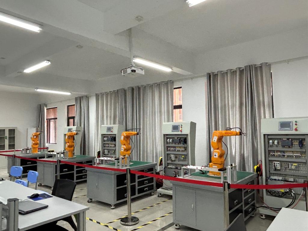 本实验室于2025年5月建设完成并投入使用,建筑使用面积115m2。机器人拆装与维修平台由机械拆装实训系统、电气系统拆装实训系统、机器人拆装变位工装、工业机器人功能验证系统等设备组成。该平台设置了机械装置装配、电气装置装配、整机装配、整机调试、校准、标定、维护与保养、维修、培训与管理等功能,可完成工业机器人装调与维修实训任务,能够满足工业机器人装调维修的理论考核和实训考核任务,符合技能鉴定考核标准;该平台采用模块式结构,按工业标准要求设计,结构简单、紧凑,适用于机器人装调与维修实训,可锻炼学生动手能力和精密装配能力,并且各单元模块可以拆装到螺钉级。使学生更深入了解工业现场常用的机器人本体内部机械结构、机械连接、电机安装、减速器装配、同步带传动等。